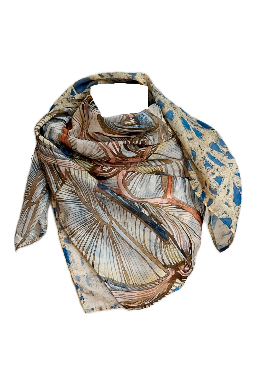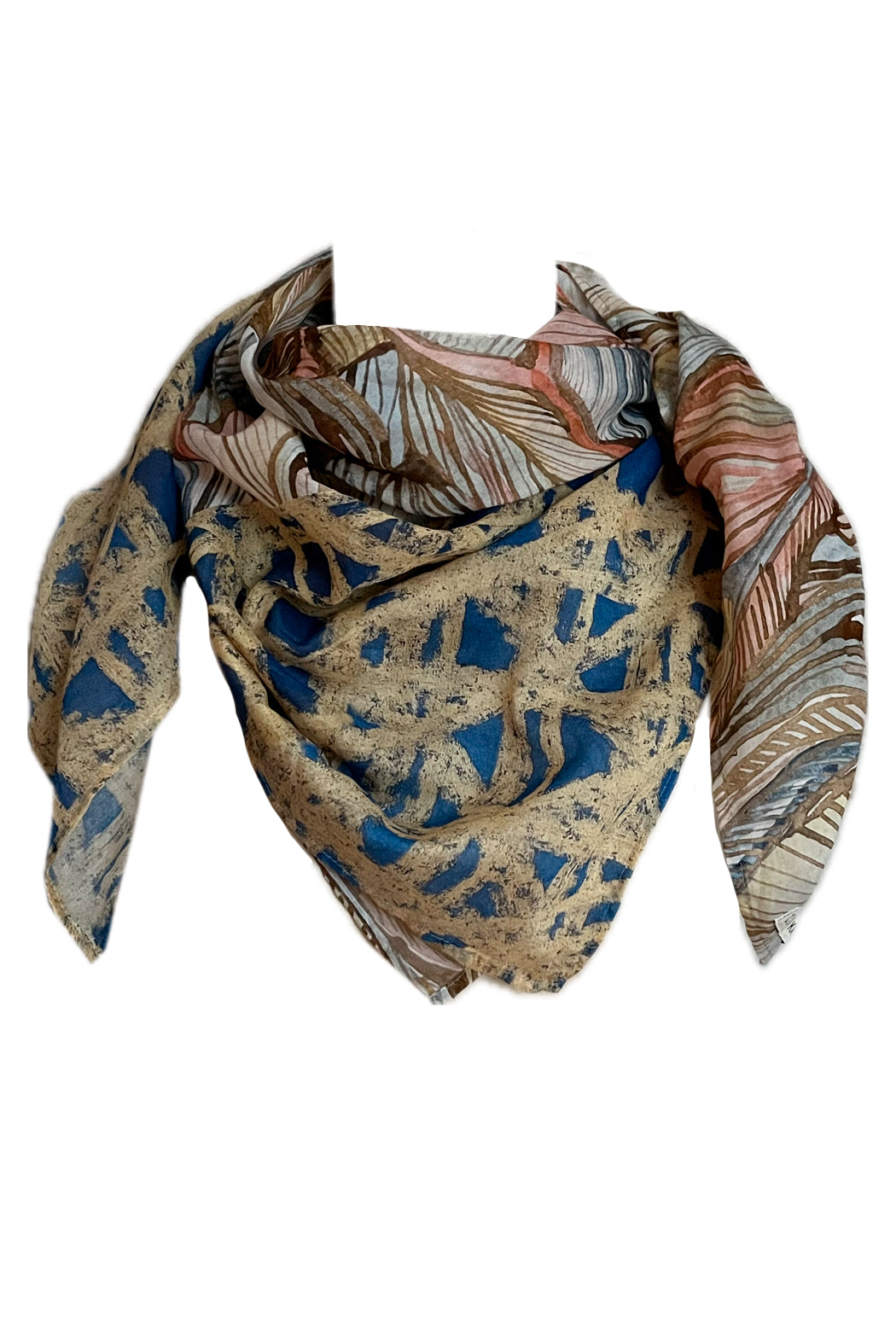 A delicate golden pattern covers our pastel-colored aquarelle painting. One section of the scarf is printed with a contrasting abstract yellow and blue chalk drawing. Since we design our own prints, we also make scarves to match our fashion! Printed on a delicate cotton-silk blend, they are an elegant accessory for every day.
