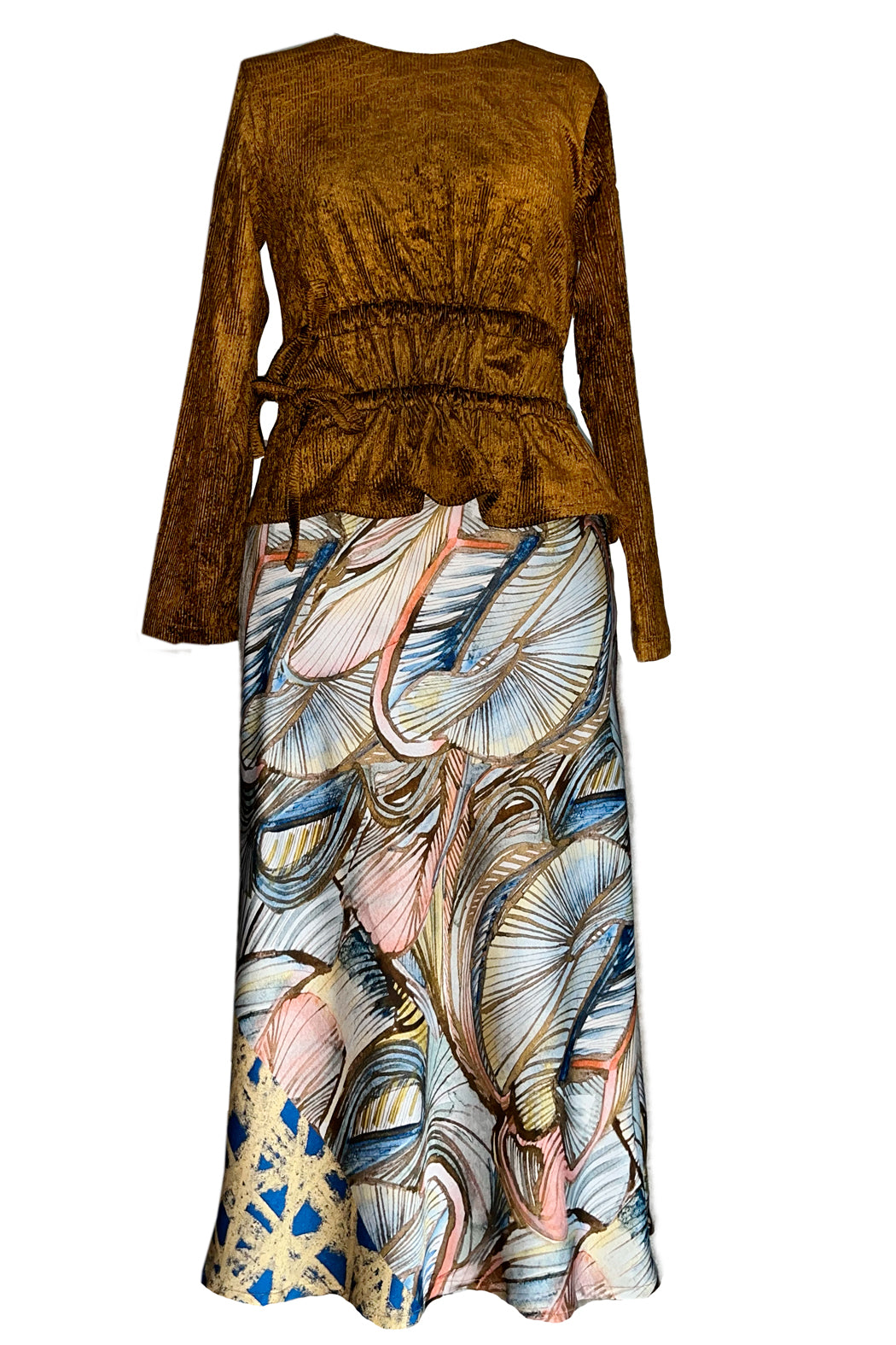 This elegant blouse is made of soft corduroy in a shimmering gold-yellow color. It almost seams to sparkle. It is tailored with two stitched drawstrings. This allows you to adjust it to your figure and determine how much ruffle you want at the hem.