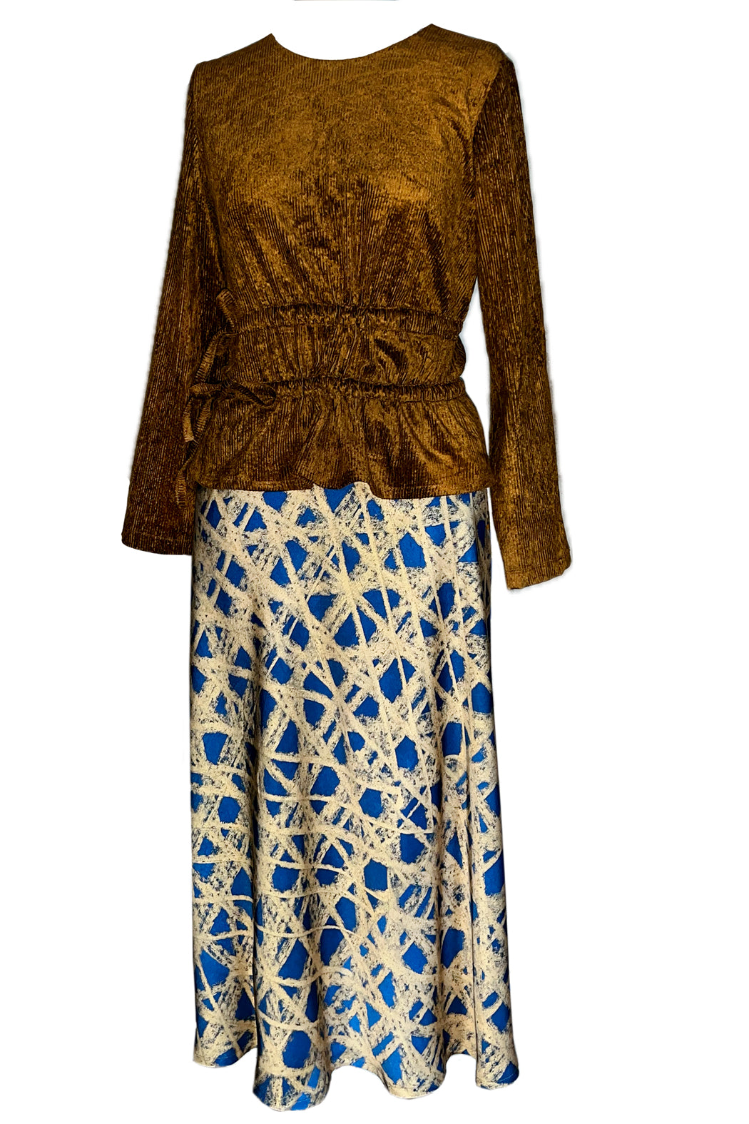 This elegant skirt with a very shiny surface has been printed with our own design in blue with yellow chalk drawings.
