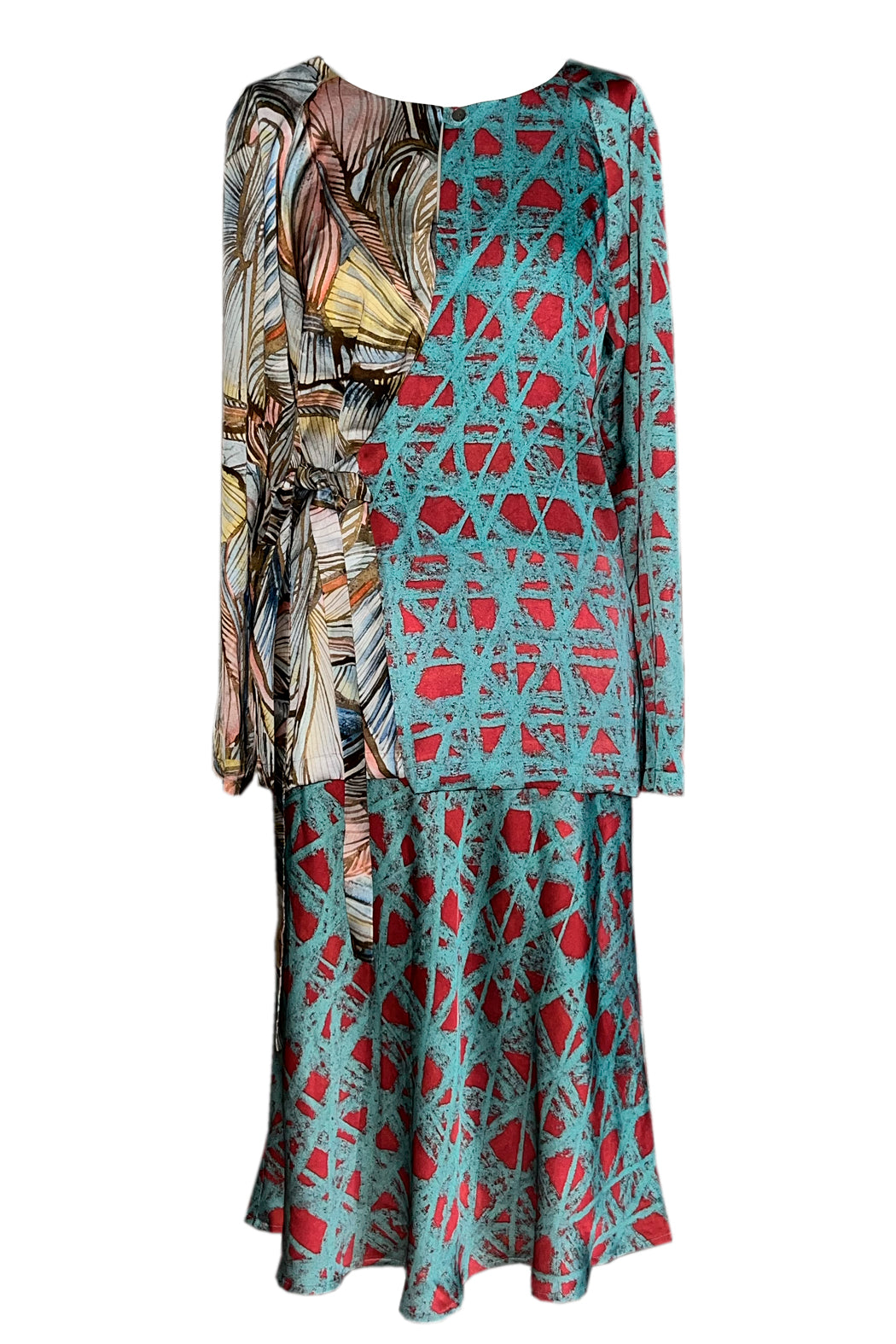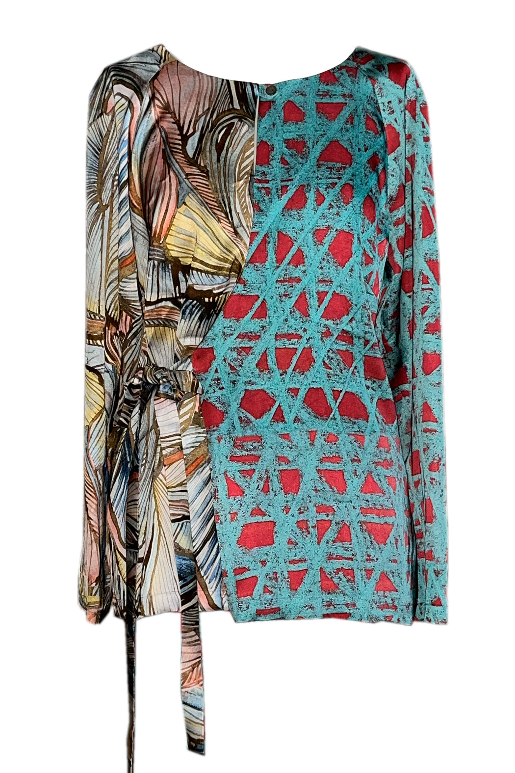 Unsere Wickelblusen sind ein toller Alltagsbegleiter für Arbeit oder Events. Mit der passenden Hose oder einem unserer gleich gemusterten Röcke ergibt sich ein elegantes Kostüm. Diese hier ist aus Ecovero-Viskose Satin, stark glänzend und mit unseren eigens entworfenen Mustern bedruckt. Hier ist die eine Seite filigran gemustert in pastellfarben mit goldenen Linien, während die andere Seite mint rot bedruckt ist. Wenn man das Band an der anderen Seite bindet rückt das mintfarbene Muster in den Hintergrund.