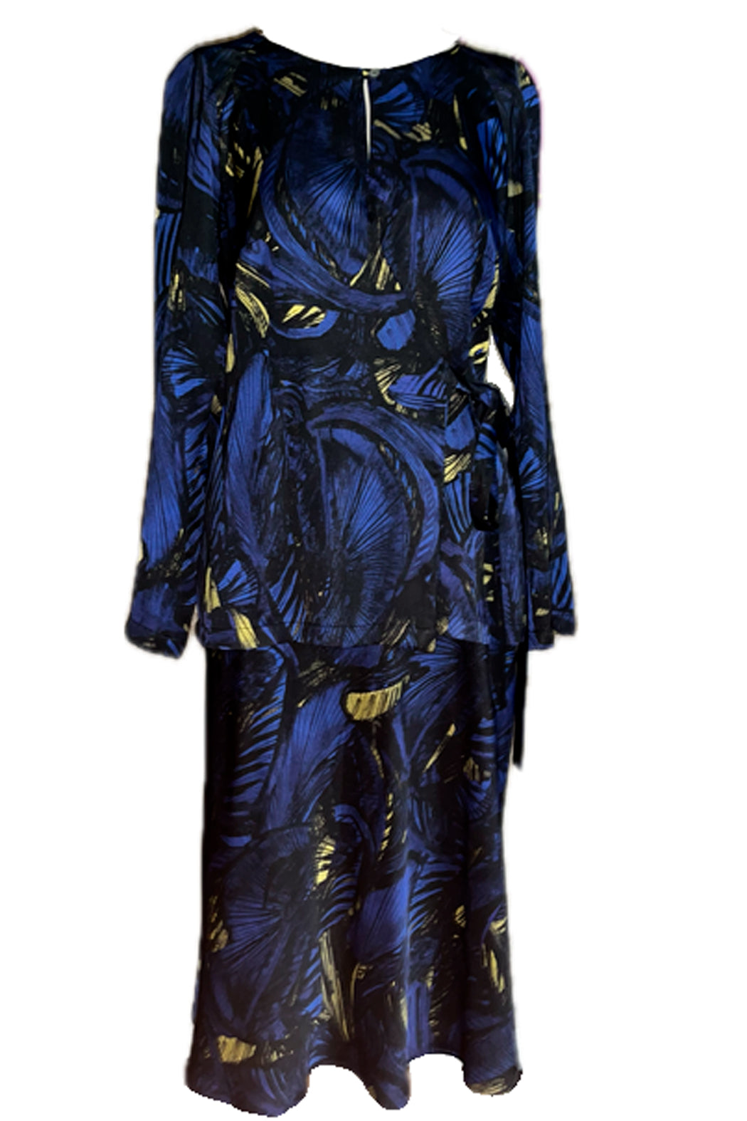 Wir haben auf eine Ecovero-Viskose Mischung unsere abstrakte Malerei gedruckt. Leuchtendes Gelb bricht aus dunklem Nachtblau und einer schwarzen Zeichnung hervor. Der Stoff hat einen sehr starken Glanz auf der Oberfläche.